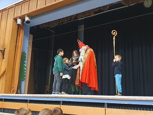 Alle Kinder versammelten sich gespannt in der Aula. Mit einem fröhlichen Lied begrüßten die Schülerinnen und Schüler den heiligen Bischof Nikolaus, der in seinem traditionellen Bischofsgewand mit Mitra und Bischofsstab eindrucksvoll einzog. Begleitet wurde er von einem großen, schweren Sack voller Überraschungen sowie seinem berühmten goldenen Buch, in dem er sich alle wichtigen Beobachtungen über die Klassen notiert hatte.