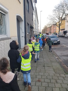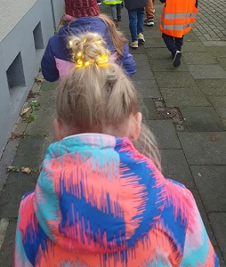 Bereits am Morgen kamen viele Schülerinnen und Schüler besonders gut ausgestattet zur Schule: Warnwesten, reflektierende Bänder, blinkende Armbänder und leuchtende Mützen sorgten dafür, dass die Kinder wie kleine Glühwürmchen leuchteten. Einige Kinder hatten sich etwas ganz Besonderes einfallen lassen und ihre Kleidung zusätzlich mit bunten Lichterketten dekoriert – ein echter Hingucker!