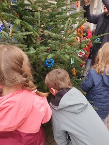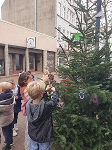 Nachdem alle Anhänger fertiggestellt waren, machten sich die beiden Klassen gemeinsam auf den Weg zur Oststraße. Voller Vorfreude und mit strahlenden Augen schmückten die Kinder ihren eigenen Baum und verwandelten ihn in ein buntes, fröhliches Zeichen der Vorweihnachtszeit. Für viele war es ein besonderes Erlebnis, ihre selbst gestalteten Werke öffentlich präsentiert zu sehen.